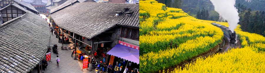 早餐后旅游大巴前往嘉阳小火车的跃进站,【乘坐旅游专列嘉阳蒸汽小火车】(已含单程火车票 80 元/人),游览沿途油菜花开美景。“呜———呜——”沿着芭石铁路向前开进。芭石铁路依山环绕而建,地势曲折险峻,隧洞和沟渠多,沿途山清水秀,梯田层叠,田园风光旖旎;铁路全长19.84公里,轨距762毫米,仅有大火车的一半;车观老鹰嘴险峻隧道,亮水陀人工彩虹(这个要看天气)欣赏蜜蜂岩人字型火车掉头,步行至芭沟古镇,沿途欣赏革命时期嘉阳矿工生活区,欣赏芭沟抗战工业遗址、矿区生态花园、苏式特色民居、清代水星古寨、民风朴实自然;